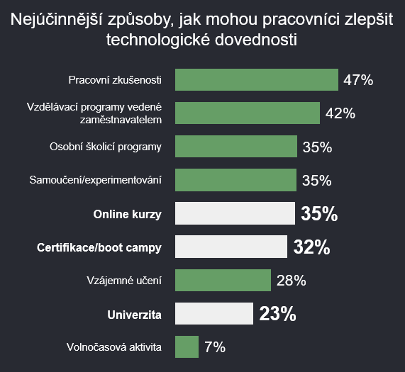 Zatímco firmy od svých zaměstnanců očekávají technologickou gramotnost a schopnost efektivně pracovat s AI, realita ukazuje na mezery v přípravě. Z průzkumu společnosti ManpowerGroup vychází, že jen 28 % firem pravidelně školí své IT zaměstnance v nových technologiích. Zároveň roste význam tzv. AI literacy – schopnosti nejen AI používat, ale porozumět jejím limitům, rizikům i etickým aspektům. Zaměstnanci, kteří tuto dovednost zvládnou, mají podle dat ManpowerGroup výrazně lepší šanci na kariérní růst. V některých firmách je schopnost práce s AI zohledňována v hodnocení výkonu.